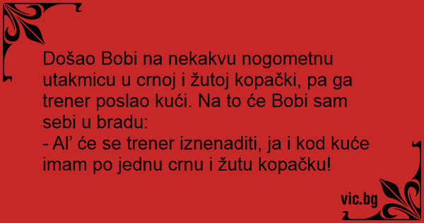 Došao Bobi na nekakvu nogometnu utakmicu u crnoj i žutoj kopački, pa ga trener poslao kući. Na to će Bobi sam sebi u bradu: