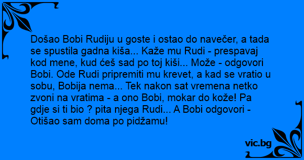 Došao Bobi Rudiju u goste i ostao do navečer, a tada se spustila gadna kiša... Kaže mu Rudi - prespavaj kod mene, kud ćeš sad po toj kiši... Može - odgovori Bobi. Ode Rudi pripremiti mu krevet, a kad se vratio u sobu, Bobija nema... Tek nakon sat vremena netko zvoni na vratima - a ono Bobi, mokar do kože! Pa gdje si ti bio ? pita njega Rudi... A Bobi odgovori - Otišao sam doma po pidžamu!