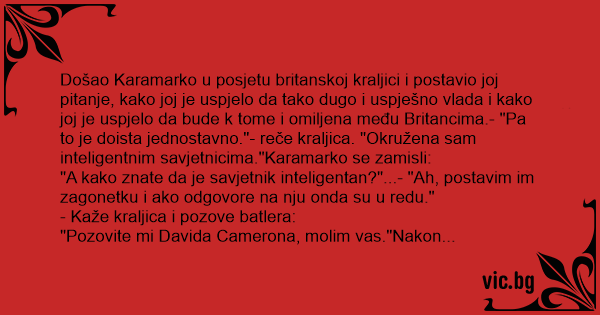 Došao Karamarko u posjetu britanskoj kraljici i postavio joj pitanje, kako joj je uspjelo da tako dugo i uspješno vlada i kako joj je uspjelo da bude k tome i omiljena među Britancima.- "Pa to je doista jednostavno."- reče kraljica. "Okružena sam inteligentnim savjetnicima."Karamarko se zamisli: