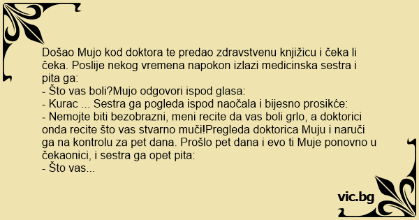 Došao Mujo kod doktora te predao zdravstvenu knjižicu i čeka li čeka. Poslije nekog vremena napokon izlazi medicinska sestra i pita ga: