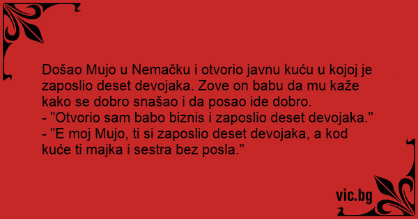 Došao Mujo u Nemačku i otvorio javnu kuću u kojoj je zaposlio deset devojaka. Zove on babu da mu kaže kako se dobro snašao i da posao ide dobro.