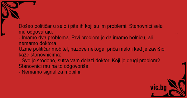Došao političar u selo i pita ih koji su im problemi. Stanovnici sela mu odgovaraju:
