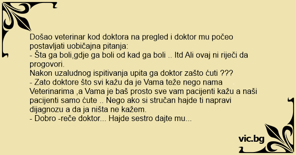 - Zato doktore što svi kažu da je Vama teže nego nama Veterinarima ,a Vama je baš prosto sve vam pacijenti kažu a naši pacijenti samo ćute .. Nego ako si stručan hajde ti napravi dijagnozu a da ja ništa ne kažem.