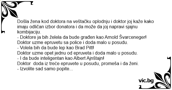 Došla žena kod doktora na veštačku oplodnju i doktor joj kaže kako imaju odličan izbor donatora i da može da joj napravi sjajnu kombijaciju.