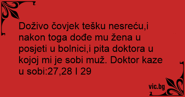 Doživo čovjek tešku nesreću,i nakon toga dođe mu žena u posjeti u bolnici,i pita doktora u kojoj mi je sobi muž. Doktor kaze u sobi:27,28 I 29