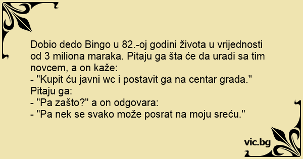 Dobio dedo Bingo u 82.-oj godini života u vrijednosti od 3 miliona maraka. Pitaju ga šta će da uradi sa tim novcem, a on kaže: