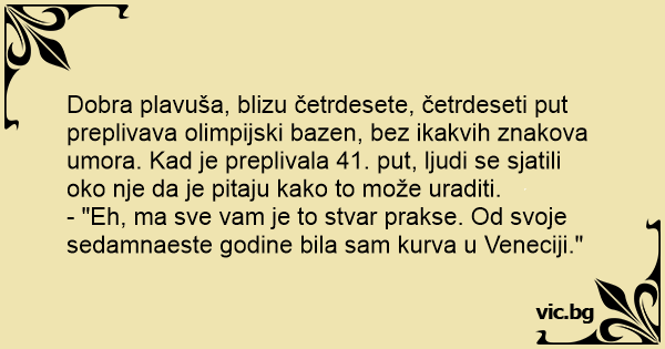 Dobra plavuša, blizu četrdesete, četrdeseti put preplivava olimpijski bazen, bez ikakvih znakova umora. Kad je preplivala 41. put, ljudi se sjatili oko nje da je pitaju kako to može uraditi.