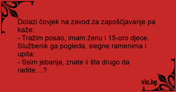 - Tražim posao, imam ženu i 15-oro djece. Službenik ga pogleda, slegne ramenima i upita: