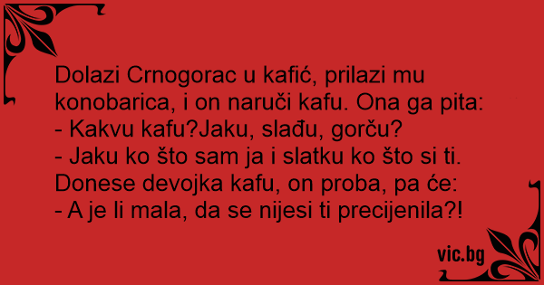 Dolazi Crnogorac u kafić, prilazi mu konobarica, i on naruči kafu. Ona ga pita: