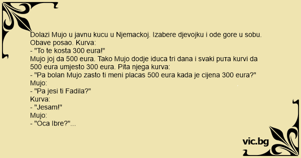 Mujo joj da 500 eura. Tako Mujo dodje iduca tri dana i svaki рuта kurvi da 500 eura umjesto 300 eura. Pita njega kurva:
