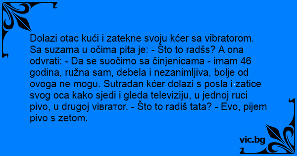 Dolazi otac kući i zatekne svoju kćer sa vibratorom. Sa suzama u očima pita je: - Što to radšs? A ona odvrati: - Da se suočimo sa činjenicama - imam 46 godina, ružna sam, debela i nezanimljiva, bolje od ovoga ne mogu. Sutradan kćer dolazi s posla i zatice svog oca kako sjedi i gleda televiziju, u jednoj ruci pivo, u drugoj viвrатоr. - Što to radiš tata? - Evo, pijem pivo s zetom.