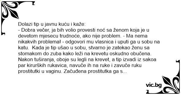 - Dobra večer, ja bih volio provesti noć sa ženom koja je u devetom mjesecu trudnoće, ako nije problem. - Ma nema nikakvih problema! - odgovori mu vlasnica i uputi ga u sobu na katu. Kada je tip ušao u sobu, stvarno je zatekao ženu sa stomakom do zuba kako leži na krevetu oskudno obučena. Nakon tuširanja, oboje su legli na krevet, a tip izvadi iz sakoa par kirurških rukavica, navuče ih na ruke i zavuče ruku prostitutki u vaginu. Začuđena prostitutka ga s nevjericom gleda i upita ga: