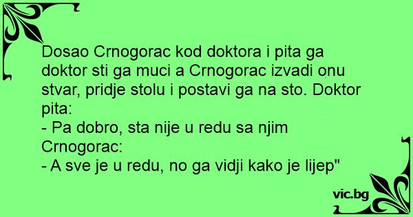 Dosao Crnogorac kod doktora i pita ga doktor sti ga muci a Crnogorac izvadi onu stvar, pridje stolu i postavi ga na sto. Doktor pita: