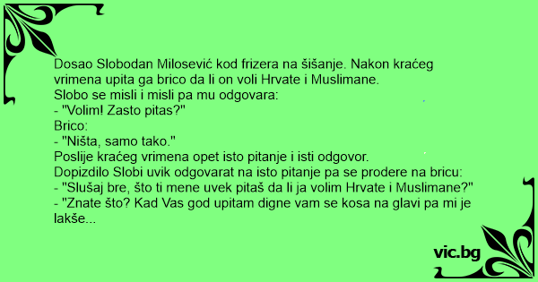 Dosao Slobodan Milosević kod frizera na šišanje. Nakon kraćeg vrimena upita ga brico da li on voli Hrvate i Muslimane.