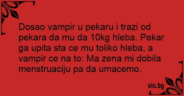 Dosao vampir u pekaru i trazi od pekara da mu da 10kg hleba. Pekar ga upita sta ce mu toliko hleba, a vampir ce na to: Ma zena mi dobila menstruaciju pa da umacemo.
