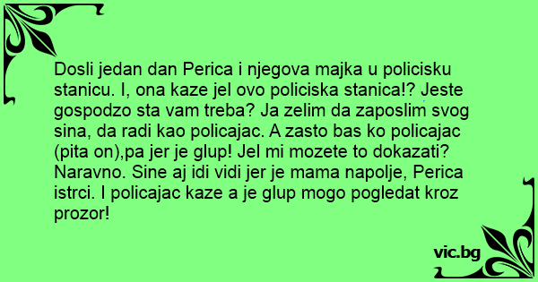 Dosli jedan dan Perica i njegova majka u policisku stanicu. I, ona kaze jel ovo policiska stanica!? Jeste gospodzo sta vam treba? Ja zelim da zaposlim svog sina, da radi kao policajac. A zasto bas ko policajac(pita on),pa jer je glup! Jel mi mozete to dokazati? Naravno. Sine aj idi vidi jer je mama napolje, Perica istrci. I policajac kaze a je glup mogo pogledat kroz prozor!