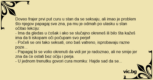 Doveo frajer prvi put curu u stan da se seksaju, ali imao je problem što njegov papagaj sve zna, pa mu je odmah po ulasku u stan očitao lekciju: