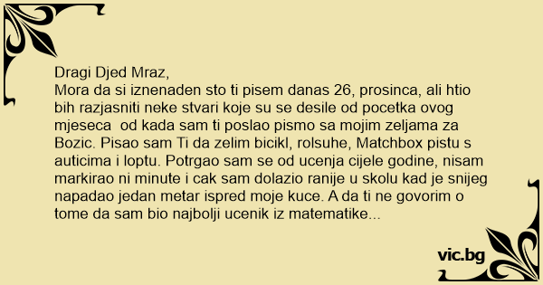 Mora da si iznenaden sto ti pisem danas 26, prosinca, ali htio bih razjasniti neke stvari koje su se desile od pocetka ovog mjeseca od kada sam ti poslao pismo sa mojim zeljama za Bozic. Pisao sam Ti da zelim bicikl, rolsuhe, Matchbox pistu s auticima i loptu. Potrgao sam se od ucenja cijele godine, nisam markirao ni minute i cak sam dolazio ranije u skolu kad je snijeg napadao jedan metar ispred moje kuce. A da ti ne govorim o tome da sam bio najbolji ucenik iz matematike te sam osvojio prvenstvo Zagreba u natjecanju najboljih matematicara svih osnovnih skola. Na cijelom kvartu nije se nitko bolje ponasao od mene, ni moj stariji brat Perica, ni mama ni tata, susjede da ne racunam, a cak mi je i