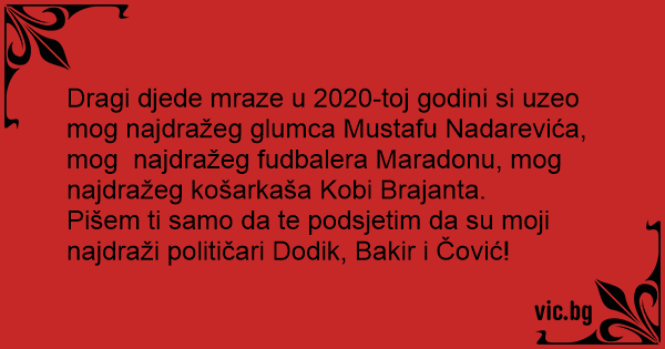 Dragi djede mraze u 2020-toj godini si uzeo mog najdražeg glumca Mustafu Nadarevića, mog najdražeg fudbalera Maradonu, mog najdražeg košarkaša Kobi Brajanta.