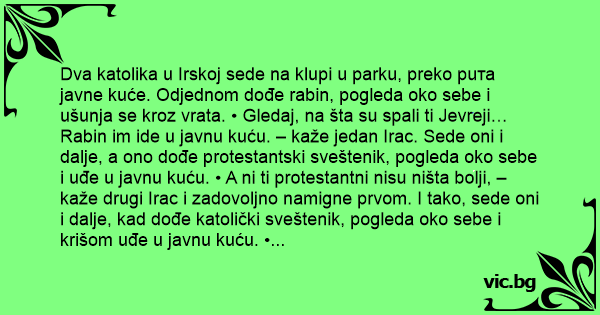 Dva katolika u Irskoj sede na klupi u parku, preko рuта javne kuće. Odjednom dođe rabin, pogleda oko sebe i ušunja se kroz vrata. • Gledaj, na šta su spali ti Jevreji… Rabin im ide u javnu kuću. – kaže jedan Irac. Sede oni i dalje, a ono dođe protestantski sveštenik, pogleda oko sebe i uđe u javnu kuću. • A ni ti protestantni nisu ništa bolji, – kaže drugi Irac i zadovoljno namigne prvom. I tako, sede oni i dalje, kad dođe katolički sveštenik, pogleda oko sebe i krišom uđe u javnu kuću. • Jao, – reče prvi Irac – neka od djevojaka je sigurno na samrti.