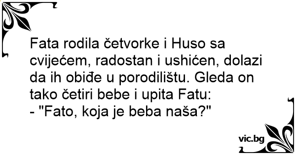 Fata rodila četvorke i Huso sa cvijećem, radostan i ushićen, dolazi da ih obiđe u porodilištu. Gleda on tako četiri bebe i upita Fatu: