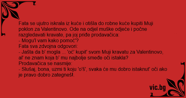 - Jašta da b' mogla ... 'oć' kupit' svom Muji kravatu za Valentinovo, al' ne znam koja b' mu najbolje smeđe oči istakla?