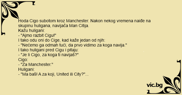 Hoda Cigo subotom kroz Manchester. Nakon nekog vremena naiđe na skupinu huligana, navijača Man Citija.