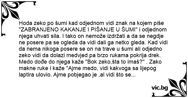 Hoda zeko po šumi kad odjednom vidi znak na kojem piše "ZABRANJENO KAKANJE I PIŠANJE U ŠUMI" i odjednom njega uhvati sila. I tako on nemože izdržati a da se negdje ne posere pa se ogleda da vidi dali ga netko gleda. Kad vidi da nema nikoga posere se on na trave u šumi ali odjedno zeko vidi da dolazi medvjed pa brzo rukama pokrija drek. Medo dođe do njega kaže "Bok zeko,šta to imaš?" . Zako makne ruke i kaže "Ajme medo, vidi kakvoga sa lijepog laptira ulovio. Ajme pobjegao je ,al vidi što se posro".