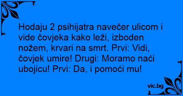 Hodaju 2 psihijatra navečer ulicom i vide čovjeka kako leži, izboden nožem, krvari na smrt. Prvi: Vidi, čovjek umire! Drugi: Moramo naći ubojicu! Prvi: Da, i pomoći mu!