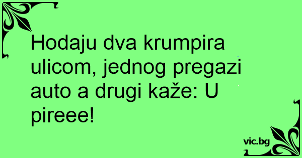 Hodaju dva krumpira ulicom, jednog pregazi auto a drugi kaže: U pireee!