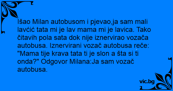 Išao Milan autobusom i pjevao,ja sam mali lavćić tata mi je lav mama mi je lavica. Tako čitavih pola sata dok nije iznervirao vozača autobusa. Iznervirani vozač autobusa reče: