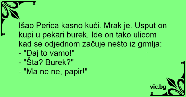 Išao Perica kasno kući. Mrak je. Usput on kupi u pekari burek. Ide on tako ulicom kad se odjednom začuje nešto iz grmlja: