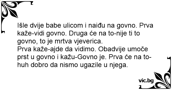 Išle dvije ваве ulicom i naiđu na govno. Prva kaže-vidi govno. Druga će na to-nije ti to govno, to je mrtva vjeverica.