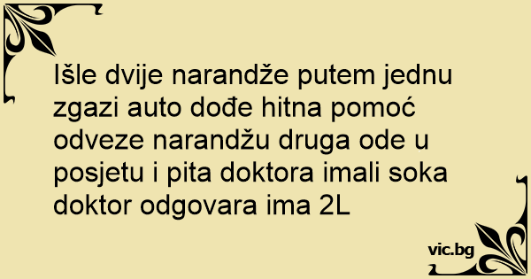 Išle dvije narandže putem jednu zgazi auto dođe hitna pomoć odveze narandžu druga ode u posjetu i pita doktora imali soka doktor odgovara ima 2L