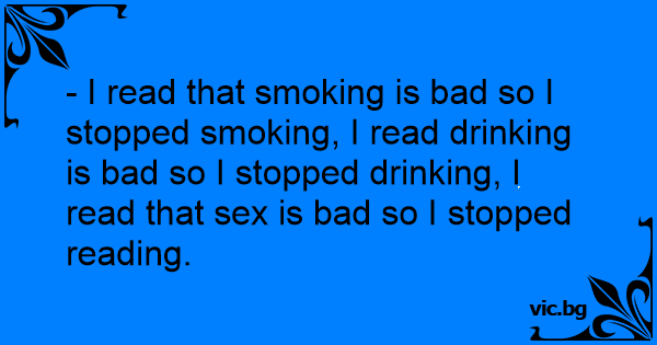 - I read that smoking is bad so I stopped smoking, I read drinking is bad so I stopped drinking, I read that sеx is bad so I stopped reading.