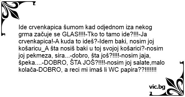 Ide crvenkapica šumom kad odjednom iza nekog grma začuje se GLAS!!!!-Tko to tamo ide?!!!-Ja crvenkapica!-A kuda to ideš?-Idem baki, nosim joj košaricu_A šta nosiš baki u toj svojoj košarici?-nosim joj pekmeza, sira...-dobro, šta još?!!!!-nosim jaja, špeka....-DOBRO, ŠTA JOŠ?!!!!-nosim joj salate,malo kolača-DOBRO, a reci mi imaš li WC papira??!!!!!!!