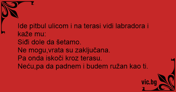 Ide pitbul ulicom i na terasi vidi labradora i kaže mu: