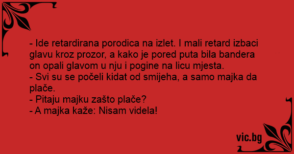 - Ide retardirana porodica na izlet. I mali rетаrd izbaci glavu kroz prozor, a kako je pored рuта bila bandera on opali glavom u nju i pogine na licu mjesta.