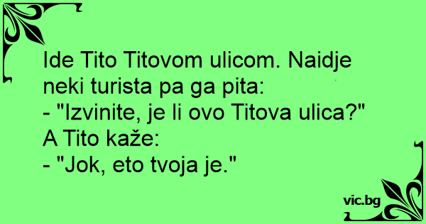 Ide Tito Titovom ulicom. Naidje neki turista pa ga pita: