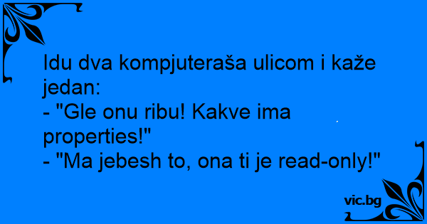 Two programmers in a bar: Do you see that chick there? Look at here “properties”! Yes, I’ve already “tested” here last night... they are read-only! Doi programatori intr-un bar: - Vezi tipa aceia? Vezi ce "properties" are? - Da. Am "testat-o" aseara... Sunt read-only Шетаат двајца програмери по улица и сретнуваат згодна девојка: Првиот. - Види какви `proprieties` имаа оваа девојка. Вториот. - Џабе ти е, она е само `read only`. Eina du kompiuteristai ir kalbasi apie priekyje einančią merginą. Vienas sako: - Pažiūrėk, kokios pas ją „properties“. O kitas: - Kas iš to, vis tiek ji „read only“. Kalbasi du programuotoji kavinėje: - O properties pas ją aukščiausio lygio! - Gaila, kad viskas read only! Vakar pats tikrinau!