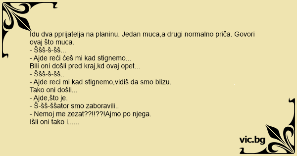 Idu dva pprijatelja na planinu. Jedan muca,a drugi normalno priča. Govori ovaj što muca.