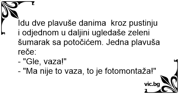 Idu dve plavuše danima kroz pustinju i odjednom u daljini ugledaše zeleni šumarak sa potočićem. Jedna plavuša reče: