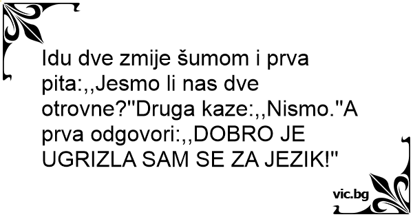 Idu dve zmije šumom i prva pita:,,Jesmo li nas dve otrovne?''Druga kaze:,,Nismo.''A prva odgovori:,,DOBRO JE UGRIZLA SAM SE ZA JEZIK!''