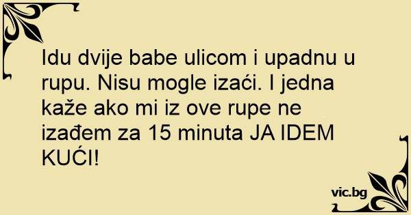 Idu dvije ваве ulicom i upadnu u rupu. Nisu mogle izaći. I jedna kaže ako mi iz ove rupe ne izađem za 15 minuta JA IDEM KUĆI!