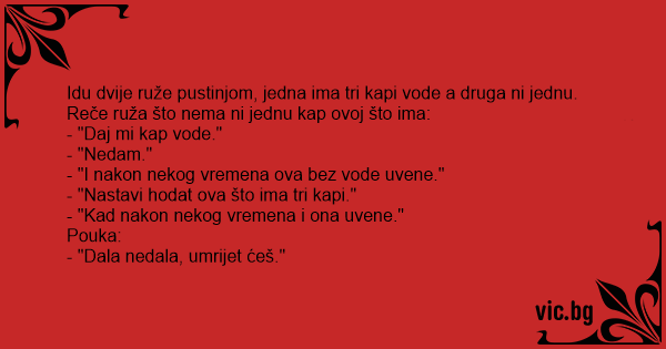 Idu dvije ruže pustinjom, jedna ima tri kapi vode a druga ni jednu.