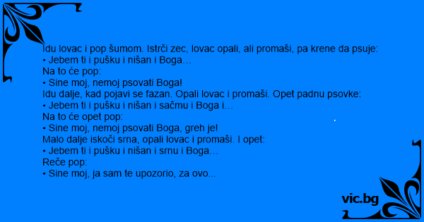 Idu lovac i pop šumom. Istrči zec, lovac opali, ali promaši, pa krene da psuje: