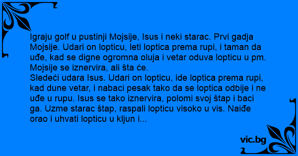 Igraju golf u pustinji Mojsije, Isus i neki starac. Prvi gadja Mojsije. Udari on lopticu, leti loptica prema rupi, i taman da uđe, kad se digne ogromna oluja i vetar oduva lopticu u pm. Mojsije se iznervira, ali šta će.
