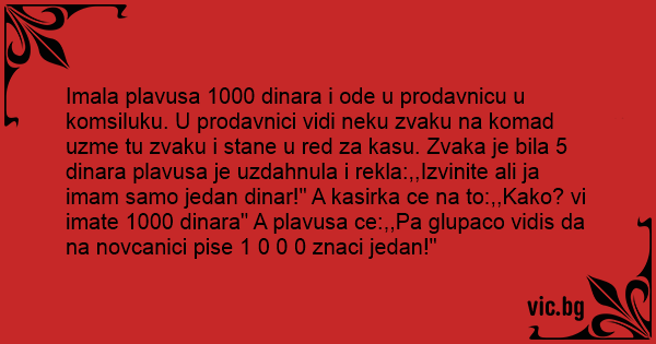 Imala plavusa 1000 dinara i ode u prodavnicu u komsiluku. U prodavnici vidi neku zvaku na komad uzme tu zvaku i stane u red za kasu. Zvaka je bila 5 dinara plavusa je uzdahnula i rekla:,,Izvinite ali ja imam samo jedan dinar!" A kasirka ce na to:,,Kako? vi imate 1000 dinara" A plavusa ce:,,Pa glupaco vidis da na novcanici pise 1 0 0 0 znaci jedan!"