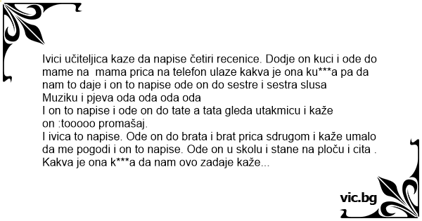 Ivici učiteljica kaze da napise četiri recenice. Dodje on kuci i ode do mame na mama prica na telefon ulaze kakva je ona ku***a pa da nam to daje i on to napise ode on do sestre i sestra slusa