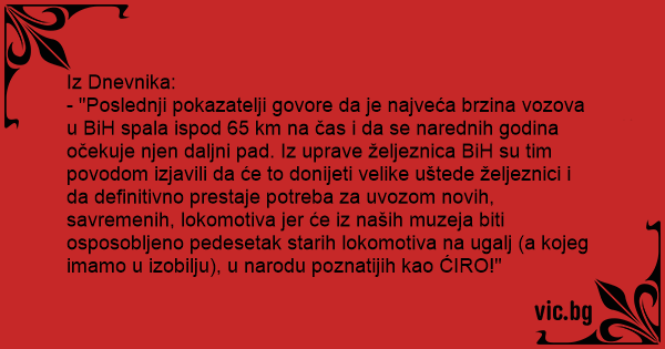 Iz Dnevnika: - "Poslednji pokazatelji govore da je najveća brzina vozova u BiH spala ispod 65 km na čas i da se narednih godina očekuje njen daljni pad. Iz uprave željeznica BiH su tim povodom izjavili da će to donijeti velike uštede željeznici i da definitivno prestaje potreba za uvozom novih, savremenih, lokomotiva jer će iz naših muzeja biti osposobljeno pedesetak starih lokomotiva na ugalj (a kojeg imamo u izobilju), u narodu poznatijih kao ĆIRO!"